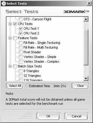 利用这些特殊的测试,我们可以对系统中CPU的性能,以及显卡的填充率、像素渲染、顶点渲染等性能进行快速测试,而不必花费较长时间完整运行3DMark05。