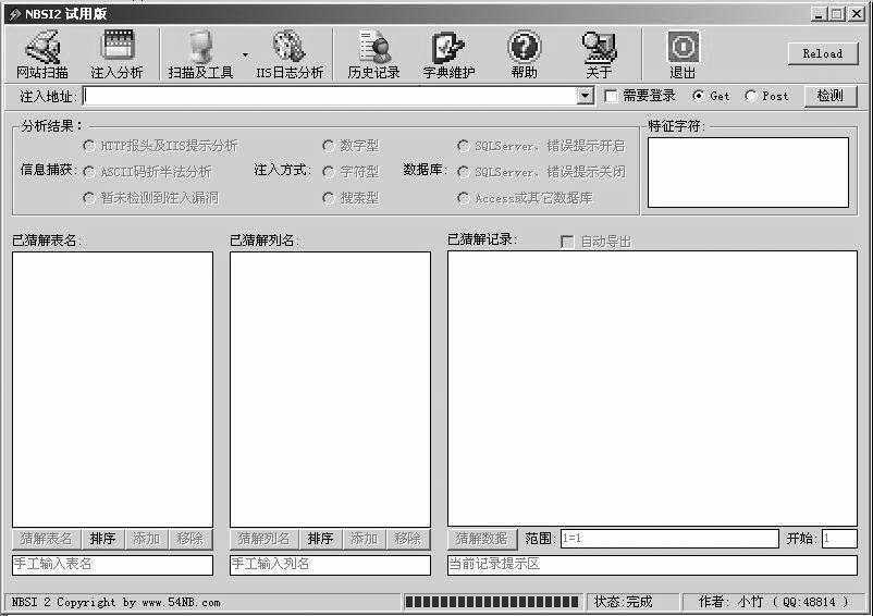 大家可以利用小竹开发的NBSI2 MSSQL(以下简称“NBSI2”)工具。不过大家要注意,工具永远只是工具,只能用来提高效率和准确性,自己一定得了解原理。