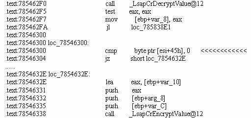 lsasrv!LsapCrDecryptValue→advapi32!SystemFunction005→advapi32!DecryptDataLength→advapi32!SystemFunction002→advapi32!DES_ECB_LM→advapi32!des