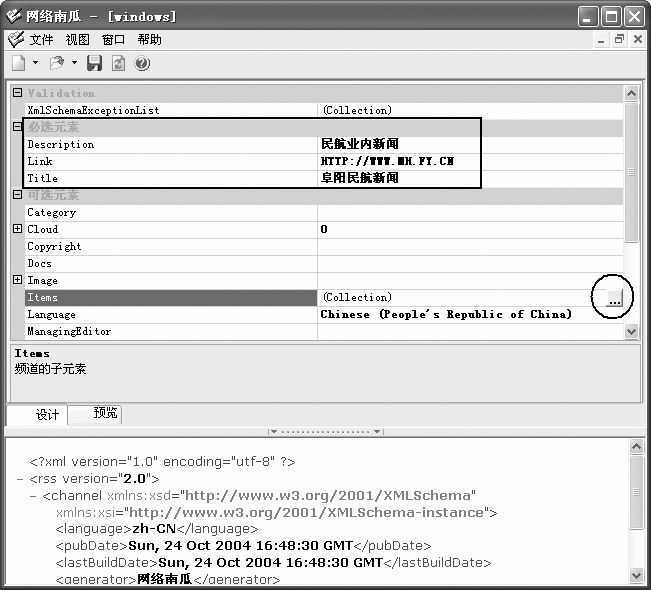 还可以使用一些如<language>(语言)、<copyright>(版权声明)等可选语句来丰富<channel>内容,具体的新闻提要就要依靠<item>来体现了。一般一条新闻就是一个<item>,<item>下至少要存在一个<title>或<description>,其他语句可以根据需要进行选择。