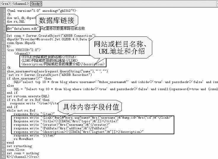 对于静态网站我们可以手工或使用工具来编写RSS输出,若是动态网站则要通过程序来转换新闻数据库内容输出RSS了。有兴趣的朋友可以在http://www.mh.fy.cn/rss2.rar处下载转换模板,此模板适合ASP+ACCESS类的动态网站更新系统,需要修改的是数据库链接部分db=*.mdb。另外在数据库字段读取以及给新闻标题(Title)和链接(Link)等字段赋值也要根据数据库的具体情况做一些修改(图3),使用该模板调试成功后,网站的RSS输出地址就是http://你的域名/rss2.asp。