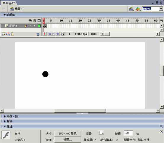 代码化后动画的优势不言而喻,如果将代码中的“_x”换成“_y”那小球将会竖直运动,如果在第一帧也加入与第二帧相同代码,动画又会怎样?大家可以试一试。同样我们还可以制作出用时间轴无法做出的效果。