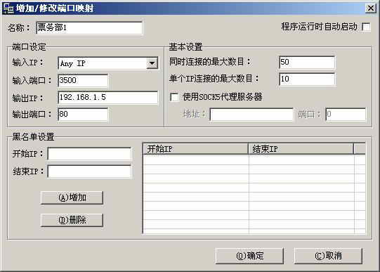 在“增加/修改端口映射”窗口的“名称”栏中输入进行映射的计算机名称(如“票务部1”),接着在“输入IP”下拉列表中选择“Any IP”,即任何IP,这样即使主机使用动态IP上网也不要紧了。在“输入端口”处填上想用的端口,这个端口就是外网用户要访问的主机的端口,可以随意设置(如“3500”)。然后在“输出IP”栏中填写要被访问的内网计算机的IP地址(如“192.168.1.5”),“输出端口”中要填写的是外网用户要访问的内网机器的端口(如开放Web服务,需要填写“80”,而开放FTP服务就需要填写“21”)。当然,别忘了勾选界面右上角的“程序运行时自动启动”,让PortMap自行启动。最后点击“确定”按钮完成设置。