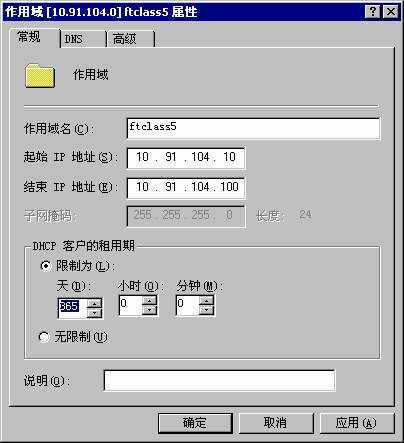看来,应该是租约设置问题,笔者在作用域的属性窗口中发现DHCP客户的租用期被设置为365天(见图)。显然,这个租期设置得太长了,这就造成即使将修好的计算机搬走,DHCP服务器照样会为它的MAC地址保留一个IP地址直到一年的租约到期。实际上,将这个非常漫长的租约期限修改为默认的8天即可。