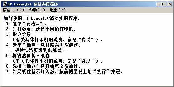 “HP LaserJet 清洁实用程序”的下载地址是http://h50176.www5.hp.com/local_drivers/9168/lj123sc.exe。运行下载文件lj123sc.exe,选择unzip将文件解压缩到HPClean目录。解压完毕后双击HPClean目录中的hppclean.exe文件即执行“HP Laserjet 清洁实用程序”。其主操作界面非常“复古”,如图1所示。然后,请按下面的步骤操作: