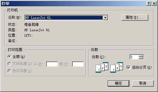 3.在打印对话框中,可于“份数”框中选择本次操作要打印的清洁页的页数,默认值为3页。对于很脏的打印机,要彻底清洁热凝器可能需要6至12页清洁页。