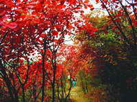 由于是阴天,雾大,光线很暗,我试着拍了几张远景,回放时看到效果很差,于是决定先拍摄近景,雾散后再拍摄远景。一片茂密的红叶林,中间有弯弯小路穿行,如一抹红云渐向深处,豁然开朗处红霞满天,艳似火!人行其中,如入童话世界。待一行行人走远时,我按下了快门,把他们远去的背影也留在了照片上。(拍摄参数:光圈F2.8、快门1/500秒、评价测光)