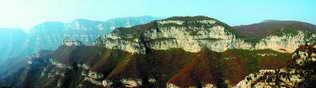 午后放晴了,顾不得疲惫,顾不得饥肠辘辘,我们赶紧趁这明媚的阳光拍摄着一幅幅绝世美景。我爬上了一座高峰,向另一座山峰望去,那山如同一个仙女着一件彩衣,在金秋贴于断壁之上,气势磅礴。它的色彩是如此的浓重洒脱,让我如在画中,流连忘返。这样的场面我难于用一张照片来表达,就自左向右连续拍了5张,回家后用佳能相机随带的软件合成了一幅全景图。(拍摄参数:F8、1/167秒、评价测光)