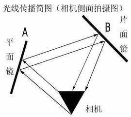 可是相机的背面、侧面、上下底面如何拍摄呢?我们以拍摄相机的侧面为例向大家介绍拍摄方法,其他各个角度的拍摄也如出一辙。实现“侧面自拍”的关键是利用平面镜对光线的反射原理,合理地摆放平面镜和相机。但是,通过一片平面镜的反射作用是无法将相机的侧面图像反射到相机的镜头中去的。所以,这时就需要两面平面镜了(图1)。