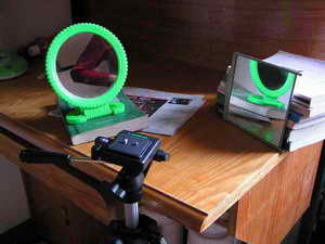 说干就干,首先是拍摄相机的正面照片。这个很简单,只要使用三脚架支稳相机,让相机镜头正对平面镜,适当调节相机高度和平面镜的仰角,使两者的中心轴在同一条直线上。最后调整好两者距离,按下快门就OK了。