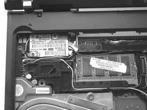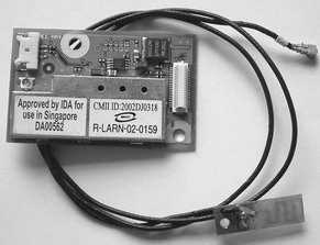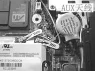 取下无线网卡上标记为“AUX”的天线(图6),把天线往内存方向折回,并让天线围绕内存一周,使天线顶端的接头回到CDC插槽位置,把蓝牙适配卡与天线连接(图7),并将蓝牙适配卡插入CDC插槽中,原先连接Modem的数据线则弃之不用。图8为蓝牙适配卡加装完成后的情形。