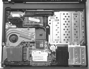 T40的无线网卡在触摸板的下方,如果要借用无线网卡的天线的话,还须拆解腕托。按图4所示,把4颗1号螺钉、1颗2号螺钉和3颗4号螺钉取下后,即可把腕托轻松卸下,机器内部结构也就显露无遗(图5)。