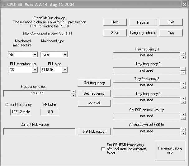 接着把本本原样装上,开机后,把最新版本的CPUFSB安装好(该软件的版本越高,支持的时钟发生器型号越多)。安装完毕后,根据提示重启电脑。再次进入Windows系统,该软件默认的是开机自动启动,并弹出启动界面,提示要注册,不用理这些,点击“OK”后,软件界面会自动最小化。