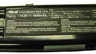 再比如华硕A3515AN-DR标配的电池是14.8V/4400mAh(见图),那么它的电芯数就是8,采用了四串两并的方式,即将四节电芯串联得到4×3.7V=14.8V,将两组串联后的电芯再并联得到2×2200mAh=4400mAh。