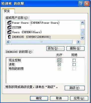 打开注册表“编辑→权限”,在弹出的对话框中选择“名称”列表框中需要进行访问权限控制的用户。如果要设定所选用户的权限为可以浏览“特训班”项目,但不允许修改,就勾选“权限”列表框中“读取”项目。如果设定用户权限为可以浏览、修改和保存这个项目的内容,则勾选“完全控制”项目(图4)。