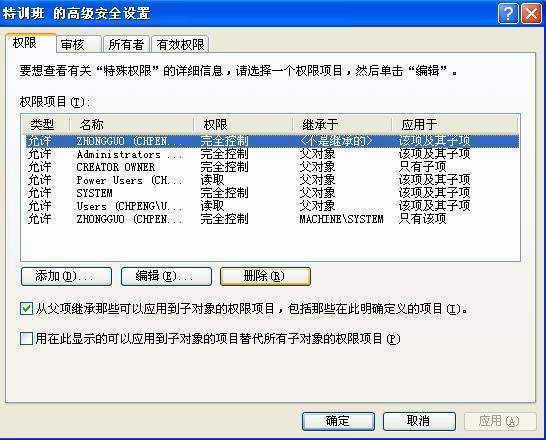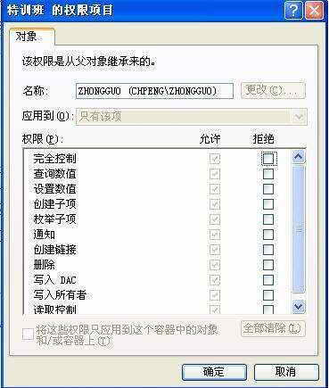 “当然,有时候用户需要的权限并不那么简单,这个时候就需要使用特殊权限的设置了,”教官点击“高级”按钮,在打开的对话框中进行设置。比如希望用户能够对“特训班”子项下面的其他子项和值进行操作,在“从父项继承那些可以应用到子对象的权限项目”的复选框中打上小钩(图5)。