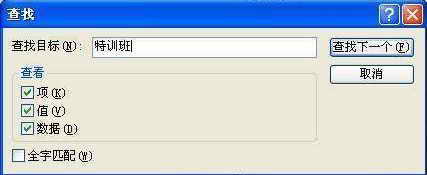 为了让学员迅速掌握查找功能,教官亲自进行了演示。首先选择“编辑→查找”,或按快捷键“Ctrl+F ”,打开“查找”对话框(图7),在“查找目标”文本框中输入要查找的项目名称“特训班”,单击Enter 键或单击“查找下一个”按钮,即可开始进行查找。