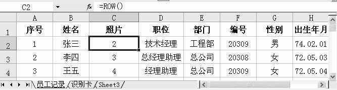 首先需要建立一个如图1所示的“员工记录”工作表,设计好表格并输入全部员工资料。留出C列准备用于保存照片。
