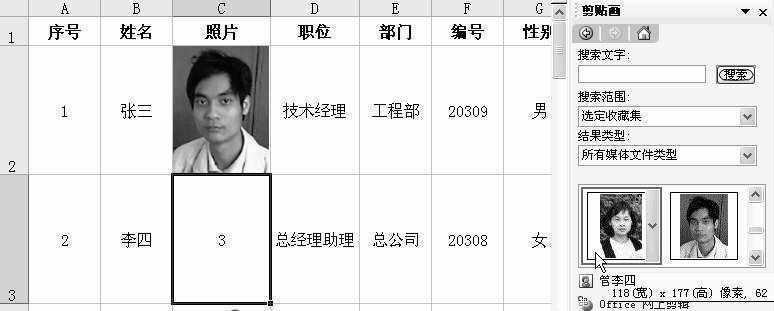 从剪贴画中随便插入一张图,选中这张图,在编辑栏中输入公式=X,回车确定后马上可以看到图片变成了员工记录表中的相应照片,拖到要放照片的C3单元格位置(图5),此时可适当调整大小,不过要注意保持原图比例。在此决定显示数据的是D10中的序号。