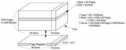 NAND在架构上是以页面为基本单位,存储页是很基本的单位。一个存储页可以放置512Byte的数据,在大容量的NAND里,存储页的容量可以是512Byte的整数倍,比如一些大于等于256MB的产品就经常采用2048Byte容量的存储页。