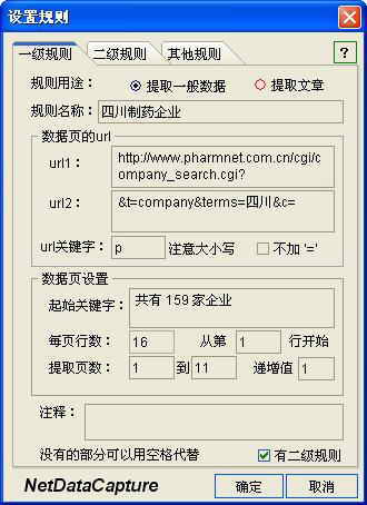 在使用网络数据库探索者前我们要摸清页面的规律,一般可以从两、三个所需页面的链接地址对比中找到规律。在“四川”的企业列表中进入第二、第三页,发现它们的地址分别为:http://www.pharmnet.com.cn/cgi/company_search.cgi?p=2&t=company&terms=四川&c=和http://www.pharmnet.com.cn/cgi/company_search.cgi?p=3&t=company&terms=四川&c=,可见地址变化的就是p的值,依此类推就可以得出p=4是第四页、p=5就是第五页……这里的p就是数据页的url关键字,其前面的地址部分http://www.pharmnet.com.cn/cgi/company_search.cgi?是url1,后面的&t=company&terms=四川&c=则是url2了。