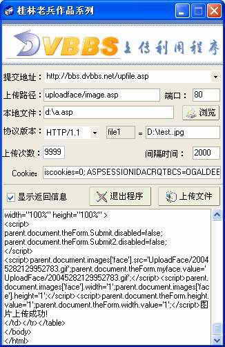 这是浏览器返回给本地机器的内容,得到了这两段数据之后,鹿采薇已经清楚地知道,自己基本上已经拿到了打开天堂之门的钥匙了。她将早就从黑客营兵器库中取回来的动网SP2上传工具打开,将早已经准备好的ASP木马选中,然后按照软件的说明,非常简单地依次填入捕捉到的信息(见图)。