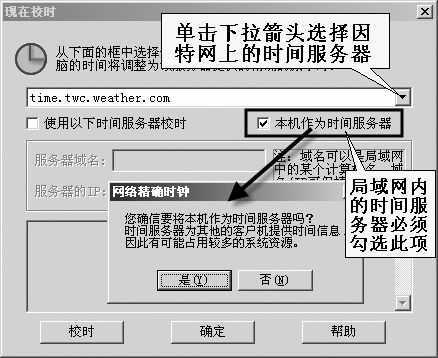 由于主机同时又要作为局域网内的时钟服务器,所以应当勾选“本机作为时间服务器”选项,在弹出的提示框中点击“是”按钮,最后点击“确定”按钮即可(图3)。