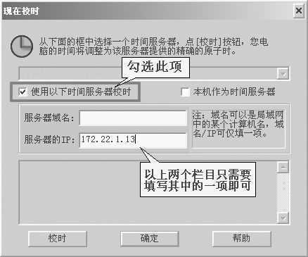 在客户机上运行“网络精确时钟”,进入“现在校时”对话框(图4),勾选“使用以下时间服务器校时”选项,然后在“服务器域名”或者“服务器的IP”栏中输入相应的参数即可。例如,经理室电脑的计算机名为“manager”,IP地址为“172.22.1.13”,那么在客户机上的“服务器域名”栏中便可以填入“manager”,或者在“服务器的IP”栏中填入“172.22.1.13”,最后点击“确定”按钮即可。