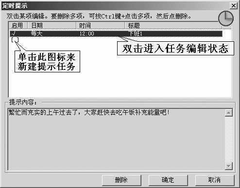 右键点击时钟面板,在弹出的右键菜单中选择“定时提示”,将会打开“定时提示”对话框。软件允许我们建立多个定时提示任务,这正好符合果冻的需求。双击空白项,将编辑状态激活,然后点击日期下方的下拉箭头,选择“每天”,在时间栏中输入上午下班的时间“12:00”,将任务的名称命名为“下班1”,接着在“提示内容”栏中输入定时提示的内容“繁忙而充实的上午过去了,大家赶快去吃午饭补充能量吧!”,最后点击“确定”按钮即可完成任务的建立(图5)。
