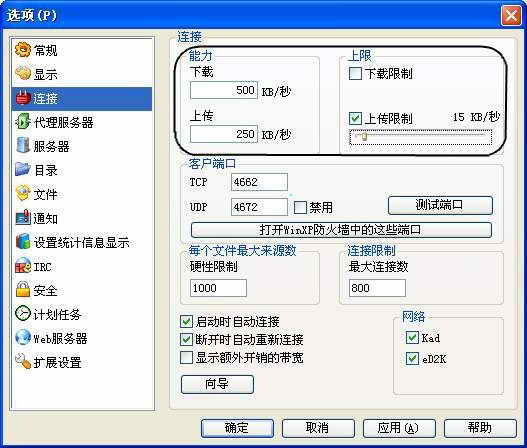 方法:在eMule主窗口中点击“选项”按钮,在打开的选项窗口左侧点击“连接”。接着在右侧窗口的“连接”区域,勾选“上传限制”,并手工调整上传的最大速度,如15KB/s(图1)。默认最大下载速度为500KB/s,最大上传速度为250KB/s。最后,点击“确定”按钮即可。