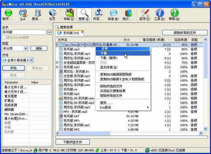 方法:运行eMule,在主窗口中点击“搜索”按钮。接着,在左侧输入搜索关键词(如“东风破”),点击“开始”按钮进行搜索。搜索完毕后,在右侧的窗口中会显示搜索到的结果,点击“普及程度(来源)”,显示的数字越大表示源越多,下载速度也就越快。接下来右键点击“普及程度(来源)”值最大的搜索结果(图2),选择“下载”就可以进行下载了。