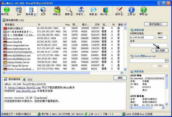 方法:在eMule主窗口工具栏点击“服务器”按钮,接着在下面的服务器列表中选择一个Ping值小、用户多、文件多的服务器,建议大家选择中文服务器(图3)。当然,如果你知道更快的服务器,可以在右侧窗口中输入服务器的IP地址或域名,使用默认端口号,输入名称后,点击“加入列表”按钮即可。