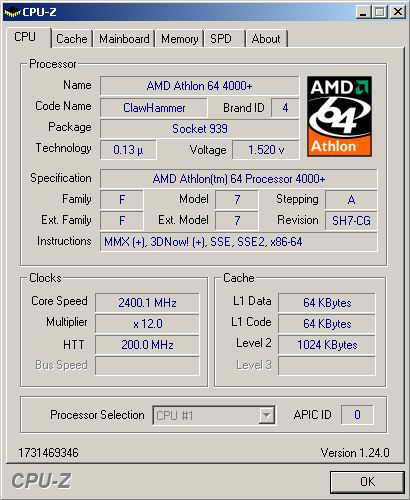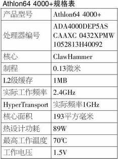 Athlon64 4000+内建了内存控制器,支持双通道内存技术,并带有1MB的L2 级缓存。初看之下,这颗处理器的规格和Athlon64 FX-53是相同的,为了进一步求证,我们查阅了官方资料,结果发现该处理器在详细规格上和FX-53也是相同的,核心都是193平方毫米,最高温度70℃,电压1.5V,热设计功耗89W。