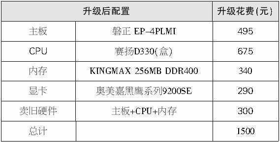 推荐理由:《仙剑奇侠传3》这类RPG游戏对显卡要求并不高,有32MB显存的3D显卡就可以让它流畅运行了,但集成显卡的联想天禧6642却无从升级显卡,所以不得不进行一次大换血。我给你推荐Intel平台的升级方案:主板采用磐正EP-4PLMI,该主板采用Micro-ATX小板设计,芯片组为Intel848P+ICH5,支持USB2.0、FSB 800MHz,主板集成ALC655 音频解码芯片,具备5.1声道音效输出,板载10/100Mbps自适应网卡,提供了3根PCI插槽,1个AGP插槽;CPU用2.6GHz的赛扬D330;内存换上KINGMAX 256MB DDR400;显卡用290元的奥美嘉黑鹰系列9200SE,这块显卡采用窄板设计,显存为64MB/64bit,还提供了DVI+S-Video输出,性能虽然平平,但应付一般RPG游戏还是没有问题的。升级总花费扣除卖掉旧配件的钱刚好1500元。