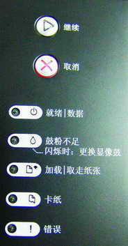 Dell Laser Printer 1700n(以下简称1700n)黑白激光网络打印机的外形延续了DELL公司稳重、严谨的作风,外形四四方方。外壳前、上、后的颜色沿用了黑蓝色,而左右两侧为银灰色。正前方有一个非常抢眼的银白色“DELL”标徽,标徽的下面有一个手动进纸器,采用吸纸设计。而手动进纸器的下面是一个可容纳250张的进纸盒。打印机上方的控制面板上有两个大的继续、取消指示灯和五个小的指示灯分别表示就绪/数据、鼓粉不足等不同的工作状态。值得一提的是每个指示灯都有中文标注(图1),这给用户操作提供了方便,在国内主流的打印机产品中较为少见。较少使用打印机的用户在不翻打印机说明书的情况下,就可以对打印机的当前状态、碳粉是否用尽、纸盒是否缺纸等一目了然。它还随机赠送了一个英文标注的控制面板,用户可以根据需要进行更换。