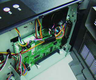 1700n打印机作为一台网络打印机,肯定少不了网络接口(10/100Mbps,RJ45口)。同时,它还为单机用户提供了一个USB接口和一个并行接口(图2)。打印机两侧外壳的一边采用活叶式固定,另一边采用锁销卡住。而该打印机的主板又在打印机的右侧(图3),这样在为打印机添加内存时,就省去了拧下螺丝钉打开外壳的步骤。