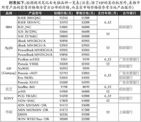 附表如下:按揭购买笔记本电脑品种一览表(注意:除了HP的某些机型外,表格中所有产品的零售价格都为官方公布的价格,而真实市场价格请参考当地产品报价)