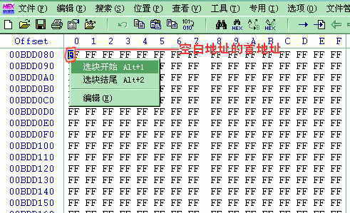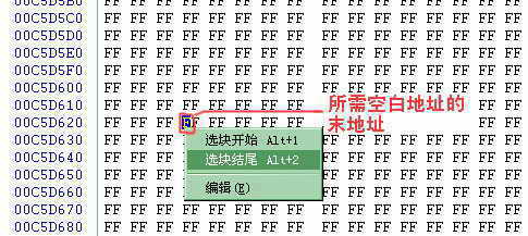 将WinHex窗口切换至打开的BIN文件,在原始文件空白地址的首地址点鼠标左键,再点右键,点“选块开始”,用同样的方法在末地址点“选块结尾”(图1、图2)。将WinHex窗口切换到铃声文件,用“Ctrl+A”组合键将文件地址全选。再次将WinHex窗口切换至BIN文件,将鼠标光标移动到空闲地址的首地址,依次点击“编辑→剪切数据→写入”,在弹出的对话框中点击“确定”,将铃声文件地址写入原始BIN文件的空白地址中。