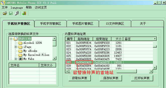 第二步,打开Samsung DIY软件,查找想要替换的手机中的内置铃声。打开原始BIN文件,在“手机铃声替换区”点击“获取铃声表”,选择要替换的内置铃声(可以通过导出铃声试听找出想替换的铃声),这里以编号为27的铃声为例(手机中为“鸟声”),记住该铃声的首地址“00A02A28”(图3)。