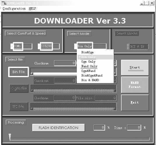 一切准备就绪,开始刷机。将手机关掉,卸掉SIM卡。用支持刷机的手机数据线将手机与电脑连接无误,打开刷机软件Downloader 3.3,首先按照图4中的标记进行相关设置。端口选择数据线接入的端口,一般是COM1;传输速率选择115200;“Select Mode”区域中的设置是关键,一定要根据刷机文件作相应设置,否则会导致刷机失败而无法开机。如果是刷新BIN文件的话就选择“Bin Only”,如果只刷新TFS文件则选择“Nand Only”,此例是刷新BIN文件,因此要选择“Bin Only”。除了以上设置外,其他选项保持默认设置。