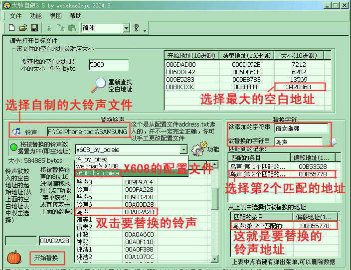 打开并选择自制的大铃声文件“倩女幽魂.mmf”,软件会自动将铃声名称字符替换。一般内置铃声都会有两个匹配的地址,双击选择第二个匹配的地址,软件右下角会将要替换的铃声地址列出。最后在自动查找出的空白地址中选择最大的地址,点击“开始替换”按钮,会弹出一个选项框,选择“同时替换”,看到弹出的成功提示,即表明替换成功。