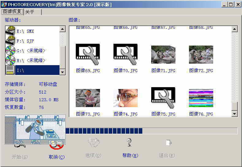 c.点击“开始”按钮,对存储卡进行扫描,能恢复的图像会马上显示出来,下部的进度条会显示扫描的进度(图1)。当全部扫描完成后,系统会提示完成,并保存已经恢复的数据,用图像浏览软件查看,是不是丢失的照片又找回来了。
