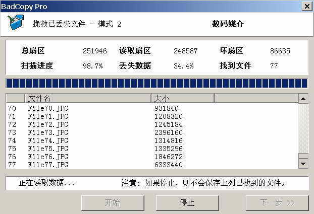 对于在使用中偶尔提示出错的存储卡,最好使用BadCopy Pro这款软件对卡进行一次扫描,因为这款软件可以提示存储卡上的坏扇区(图2),对这种卡的扫描时间会比较长,可能要几个小时,需要用户有耐心。有时虽然坏扇区比较多,但有的文件是可以恢复的,一句话,要将存储卡全部扫描完成后再看结果。对于已经损坏的存储卡,可以试试使用BadCopy Pro和EasyRecovery进行完全扫描,说不定可以恢复一些数据。