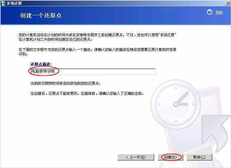 打开“创建一个还原点”选项,单击“下一步”按钮进入下个页面,在该页面中的“还原点描述”一栏中输入还原点名(图3),点击“创建”按钮便完成了还原点的创建。