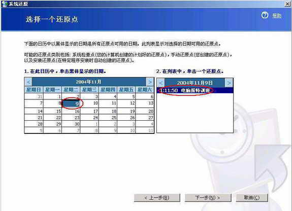 这个时候出现了一个如图4那样的窗口,里面有一个类似日历的界面。这个日历所起的作用并非是让我们知道今天是某年某月某日,而是一个还原点列表。在此日历中单击黑体显示的日期后,在其右侧列表中就会出现这一天中所创建的所有还原点(图4)。点击“下一步”按钮出现一些提示信息(图5),继续点击“下一步”按钮,这个时候就正式开始进行系统还原(图6),而后系统自动重启并完成系统还原。