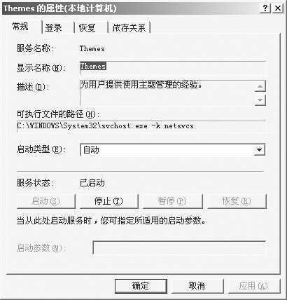 有没有办法将“土疙瘩”一样的Windows Server 2003穿上Windows XP的美丽服装呢?我们只要进入Windows Server 2003的“服务”窗口(如图),按“T”键寻找“Themes”并双击它,然后在“启动”类型中选择“自动”,下次开机时,就可以看到效果了。