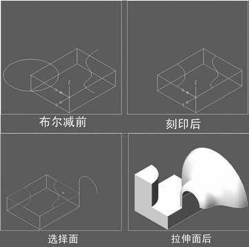 投射刻印命令的具体操作:首先选择投射刻印命令,然后选择实体,紧接着选择实体面上的平面造型,再回车即可。平面造型紧紧地刻印在了实体面上,我们当然可以拉伸被分割的面,如果被分割的面是封闭的话。刻印前后和拉伸前后的区别如图1所示,显然本命令的优点就不言而喻了。