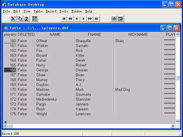 (2)再打开players.dbf文件(图1),第1行的160编号的球员就是大鲨鱼奥尼尔,而且也能看到在NCIKNAME下有Shaq的绰号。