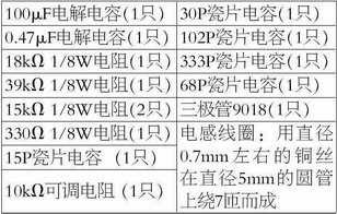 本发射器所有的元件都可以在电子市场上找到,所有需要的元件种类及数量如下表所示: