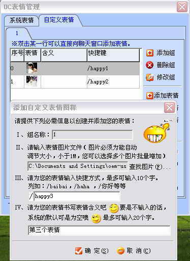 在UC2005中的操作步骤:打开好友聊天窗口,点击“表情”按钮,选择“添加自定义表情”打开“UC表情管理”对话框,先“添加组”再“添加表情”, 输入相应内容(见图),多次添加完成后点“确定”即可。